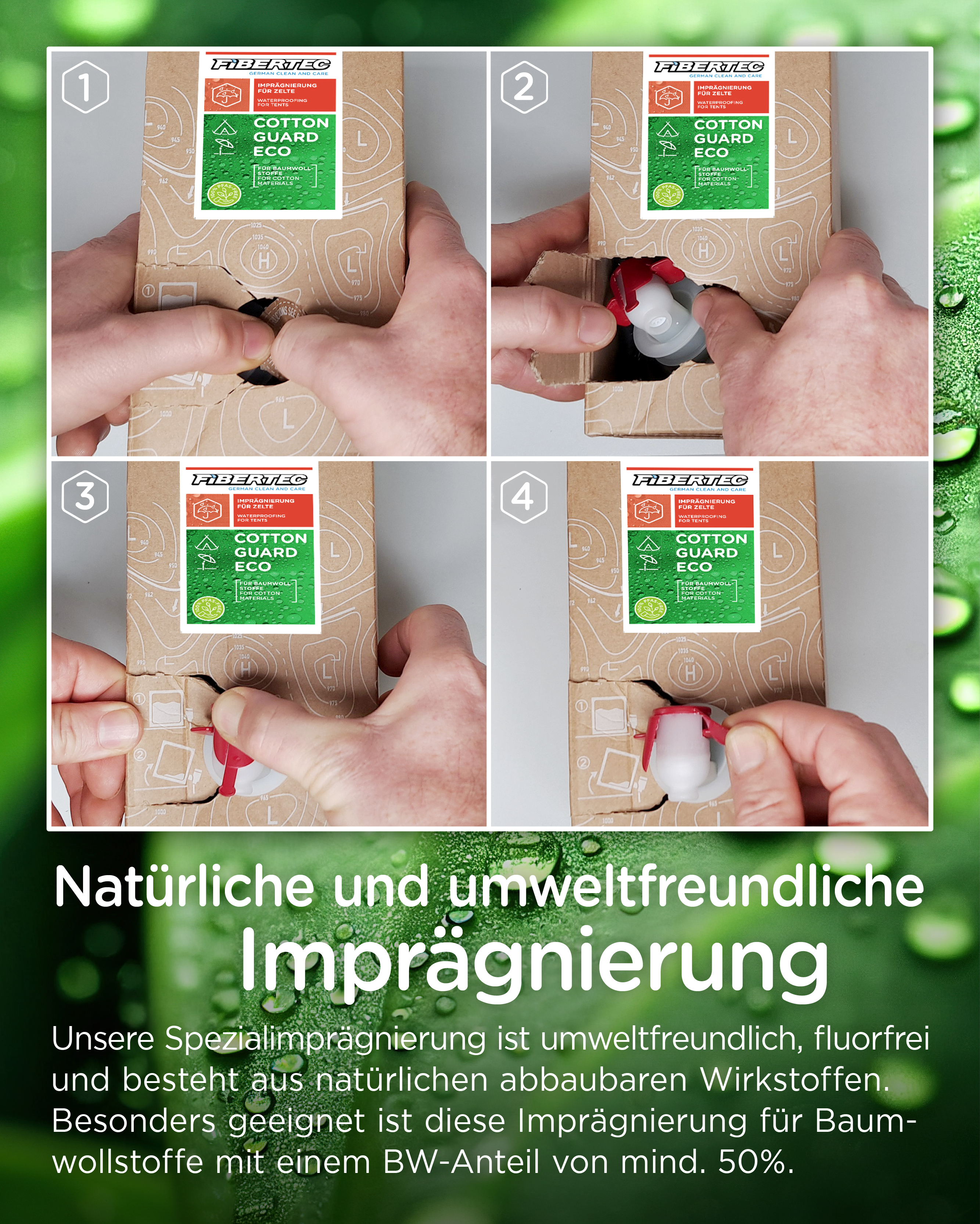 Cotton Guard Eco ist eine umweltfreundliche, fluorfreie Spezialimprägnierung mit natürlich abbaubaren Wirkstoffen für Baumwollstoffe mit einem BW-Anteil von mind. 50%. Besonders geeignet ist die Imprägnierung für Pfadfinderzelte, Jurten, Mittelalter- Marktstände, Faltboothäute, Sonnenschirme, Sonnensegel und ähnliche Gegenstände aus Baumwolle. Es wirkt stark wasserabweisend und lässt sich sehr leicht verarbeiten. Die wässrige Imprägnieremulsion aktiviert sich durch Trocknung bei Raumtemparatur. Eine anschließende Wärmebehandlung ist nicht notwendig.