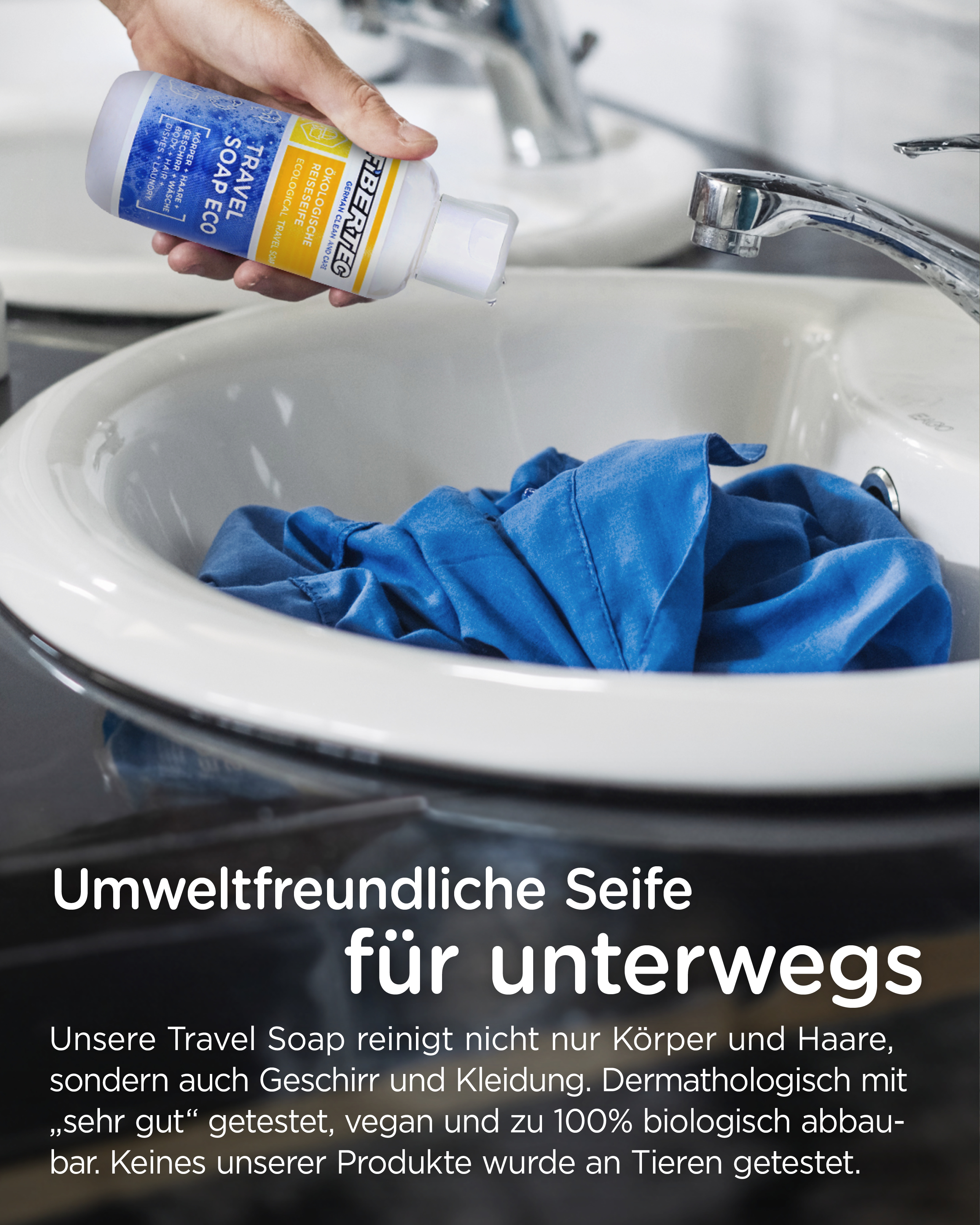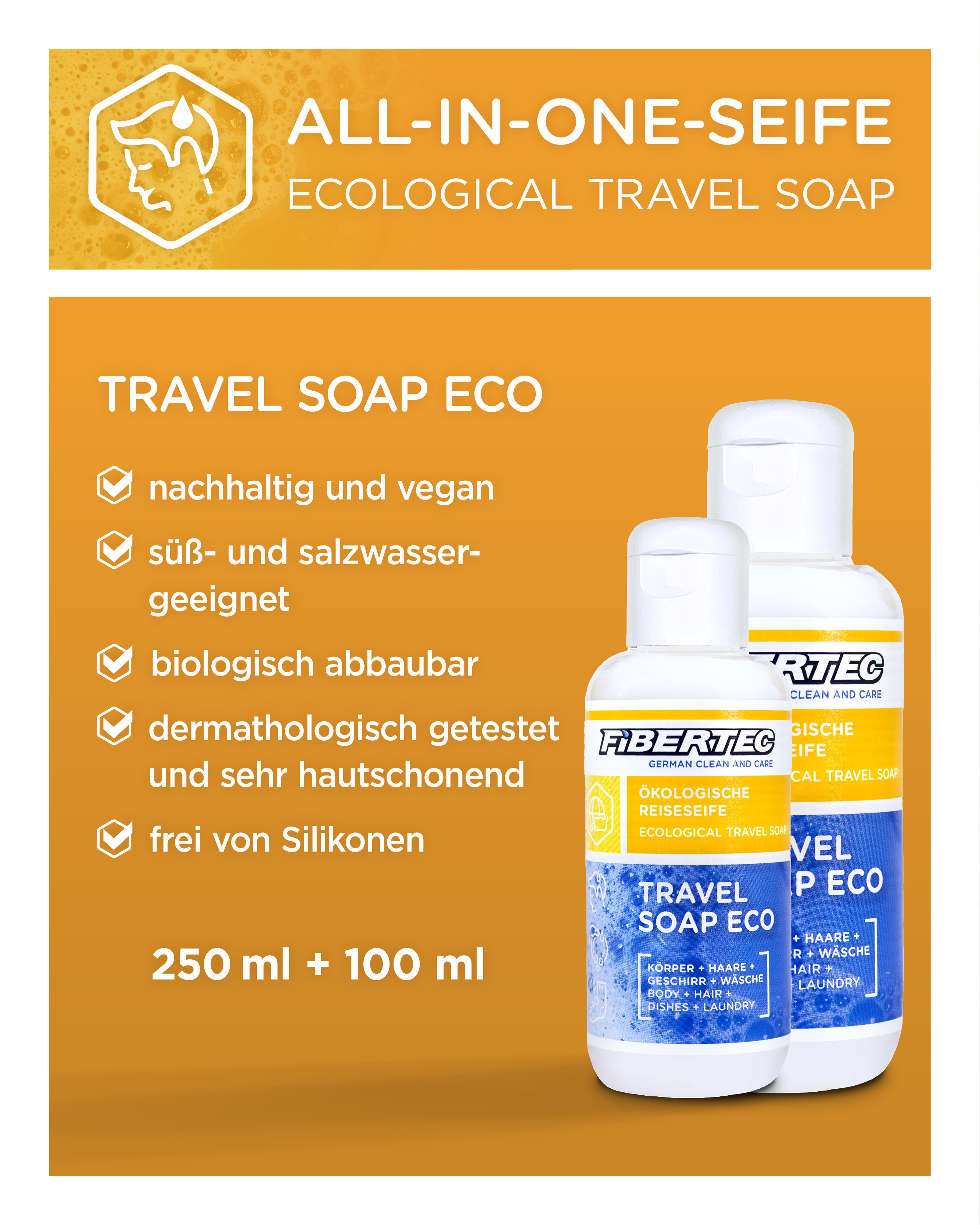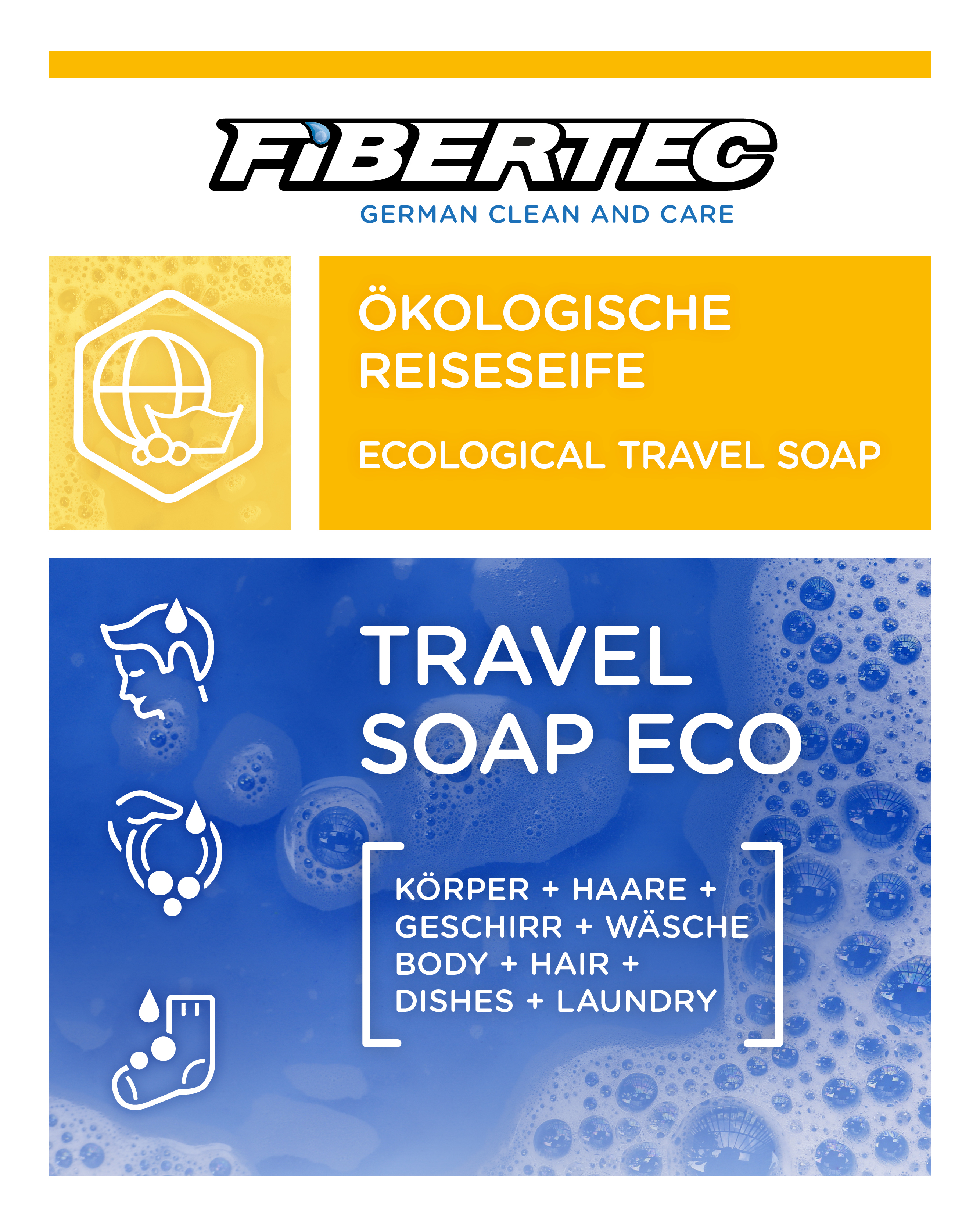 Fibertec Travel Soap Eco ist unsere »alles und überall Outdoor-Seife«. Wegen ihrer sehr milden Rezeptur und dem pH-Wert von 5,5 hervorragend für die tägliche Haar und Körperpflege geeignet. Für eine besondere Pflege der Haut sorgt der Zusatz von Dexpanthenol. Outdoor-Seife. Shampoo, Duschgel, Spül- und Waschmittel in einem. Hochkonzentriert und dadurch sehr ergiebig.