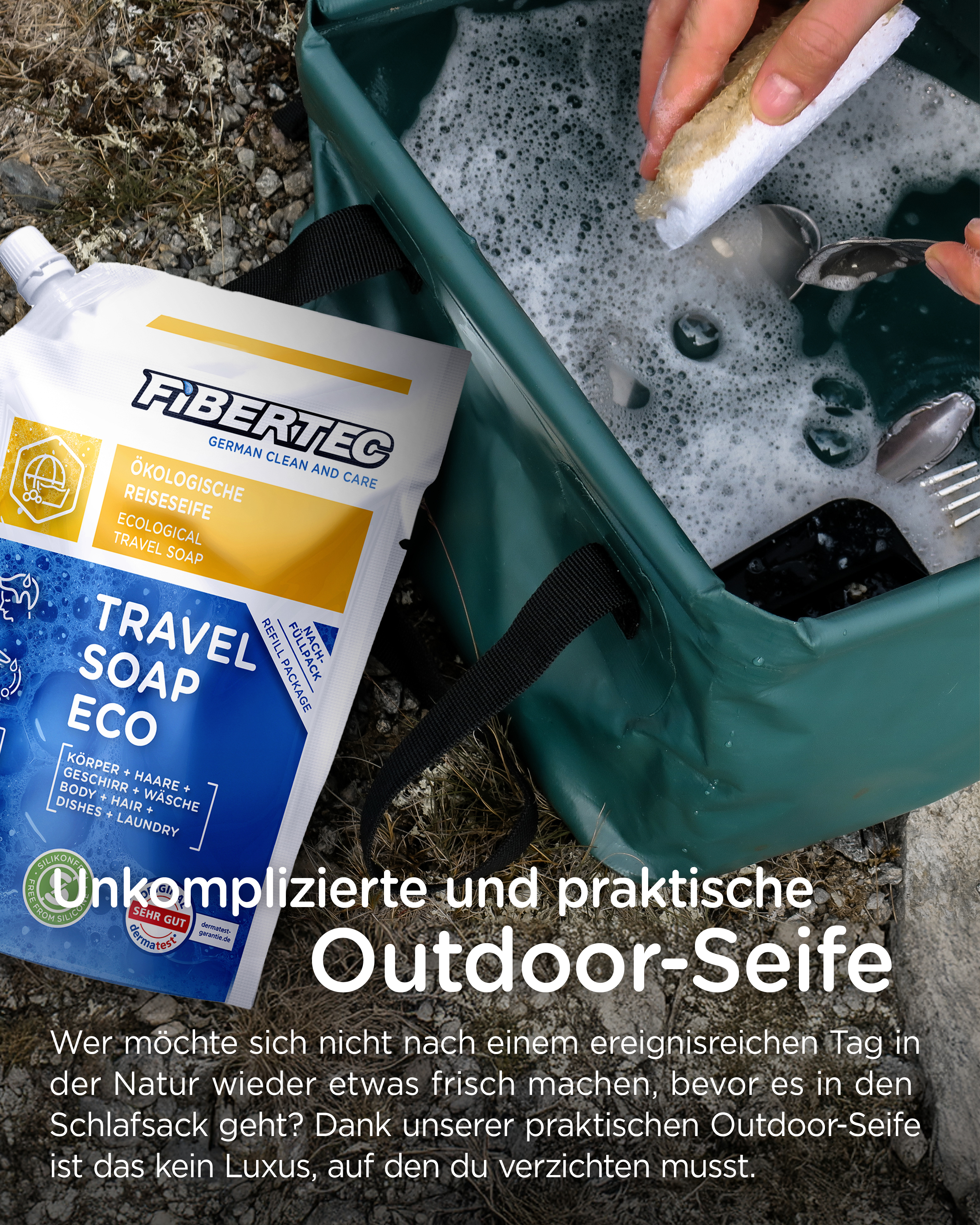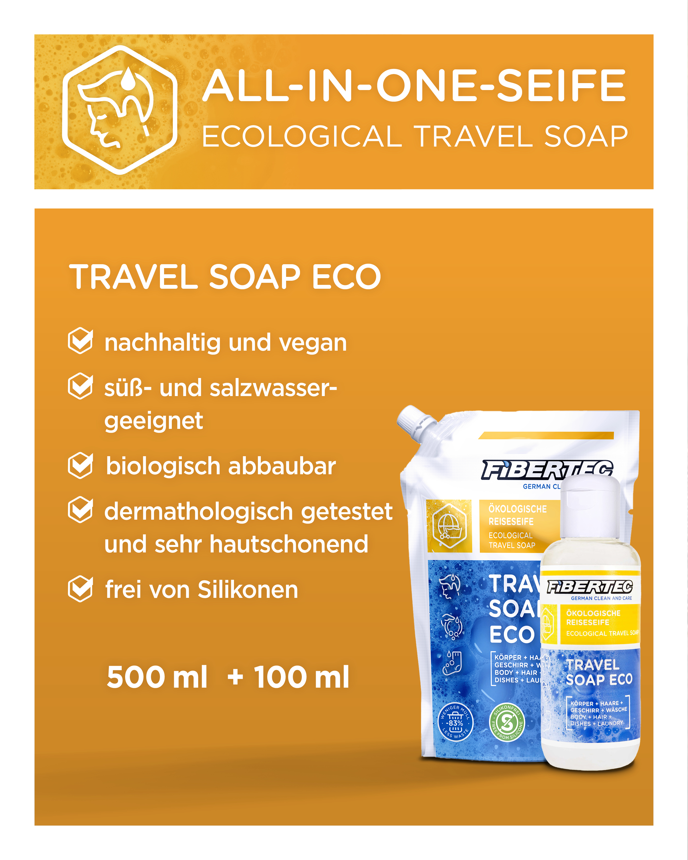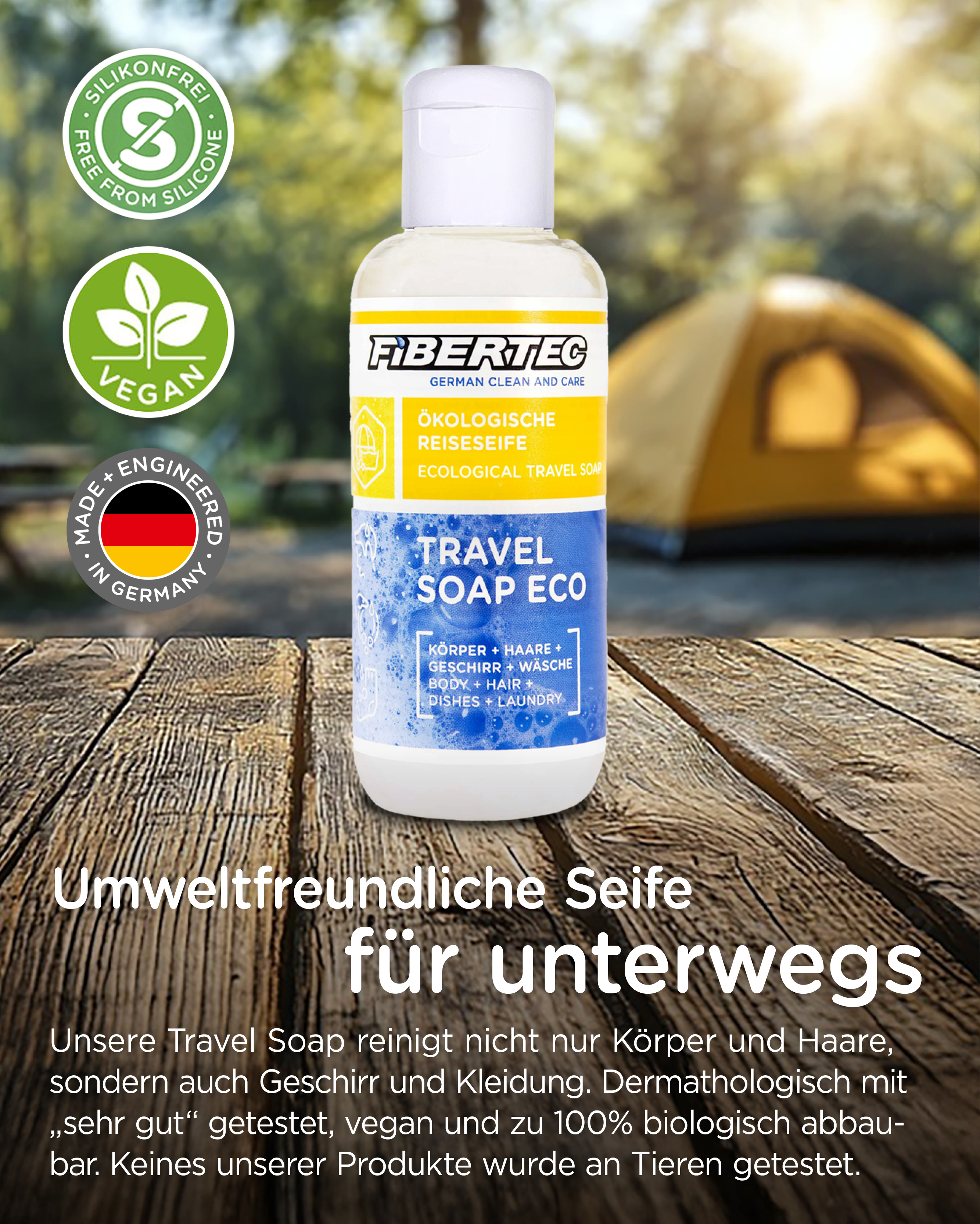 Fibertec Travel Soap Eco ist unsere »alles und überall Outdoor-Seife«. Wegen ihrer sehr milden Rezeptur und dem pH-Wert von 5,5 hervorragend für die tägliche Haar und Körperpflege geeignet. Für eine besondere Pflege der Haut sorgt der Zusatz von Dexpanthenol. Outdoor-Seife. Shampoo, Duschgel, Spül- und Waschmittel in einem. Hochkonzentriert und dadurch sehr ergiebig.
