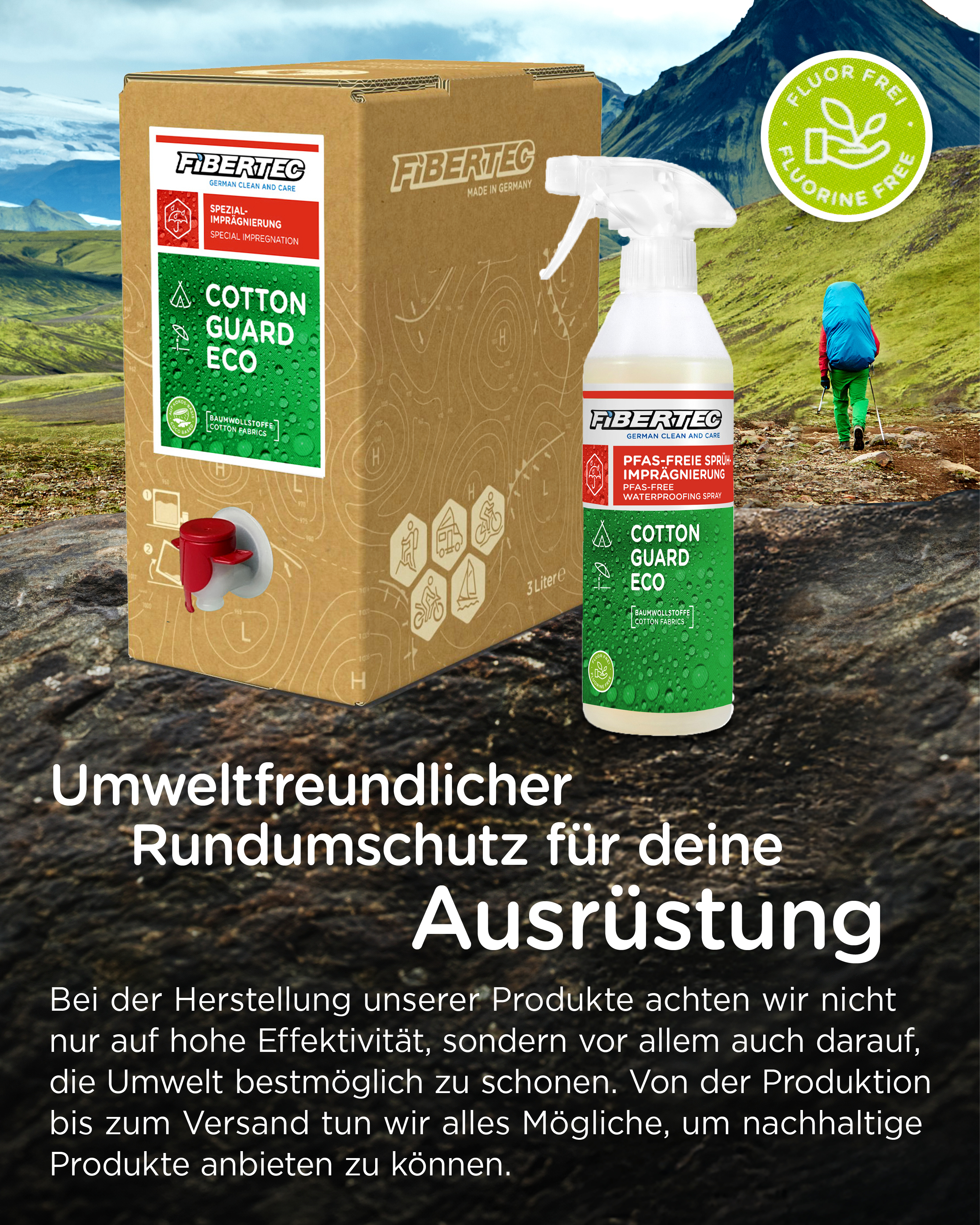Cotton Guard Eco ist eine umweltfreundliche, fluorfreie Spezialimprägnierung mit natürlich abbaubaren Wirkstoffen für Baumwollstoffe mit einem BW-Anteil von mind. 50%. Besonders geeignet ist die Imprägnierung für Pfadfinderzelte, Jurten, Mittelalter- Marktstände, Faltboothäute, Sonnenschirme, Sonnensegel und ähnliche Gegenstände aus Baumwolle. Es wirkt stark wasserabweisend und lässt sich sehr leicht verarbeiten. Die wässrige Imprägnieremulsion aktiviert sich durch Trocknung bei Raumtemparatur. Eine anschließende Wärmebehandlung ist nicht notwendig.