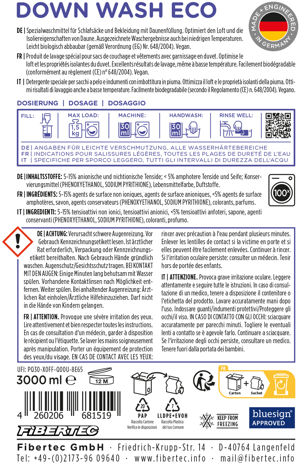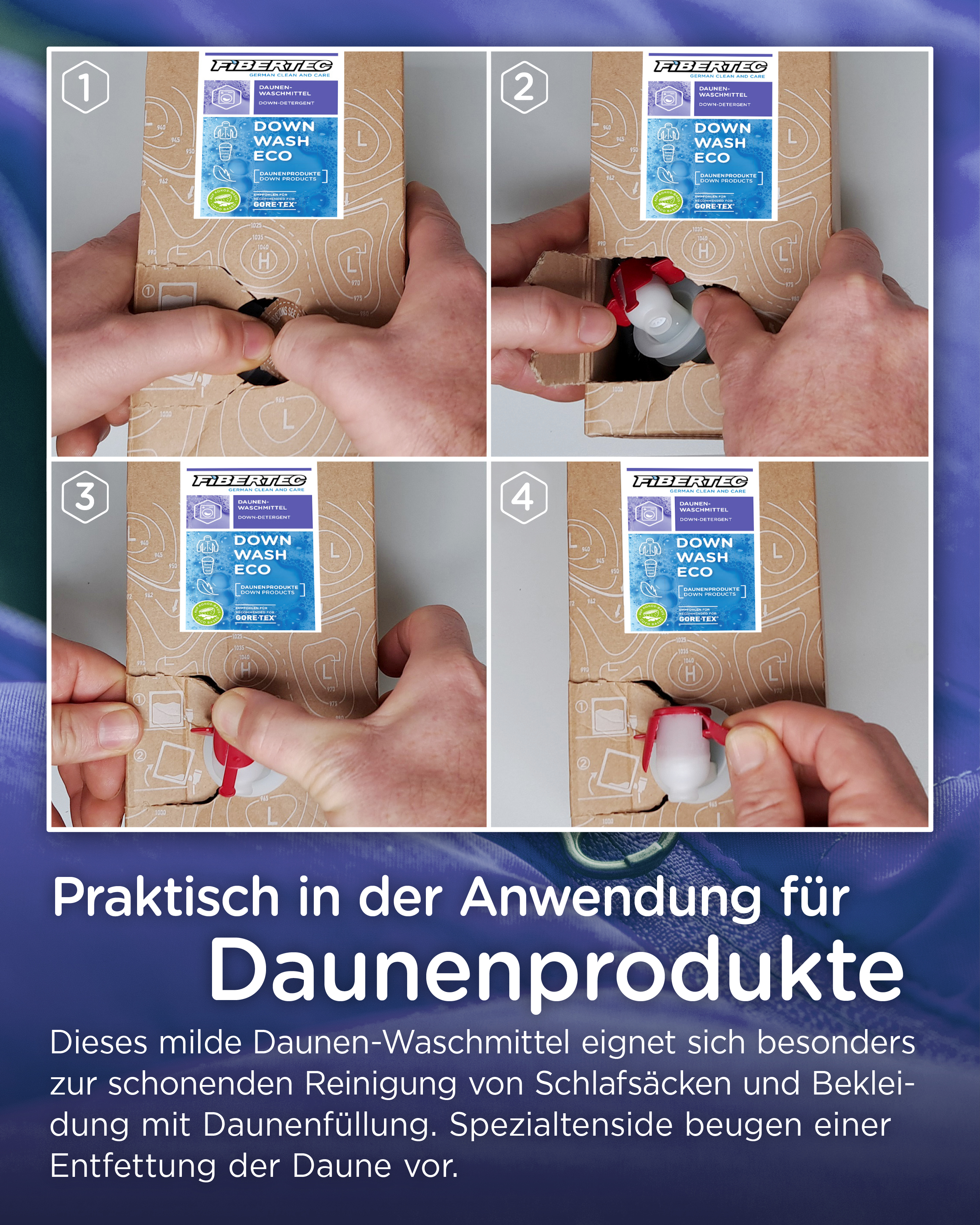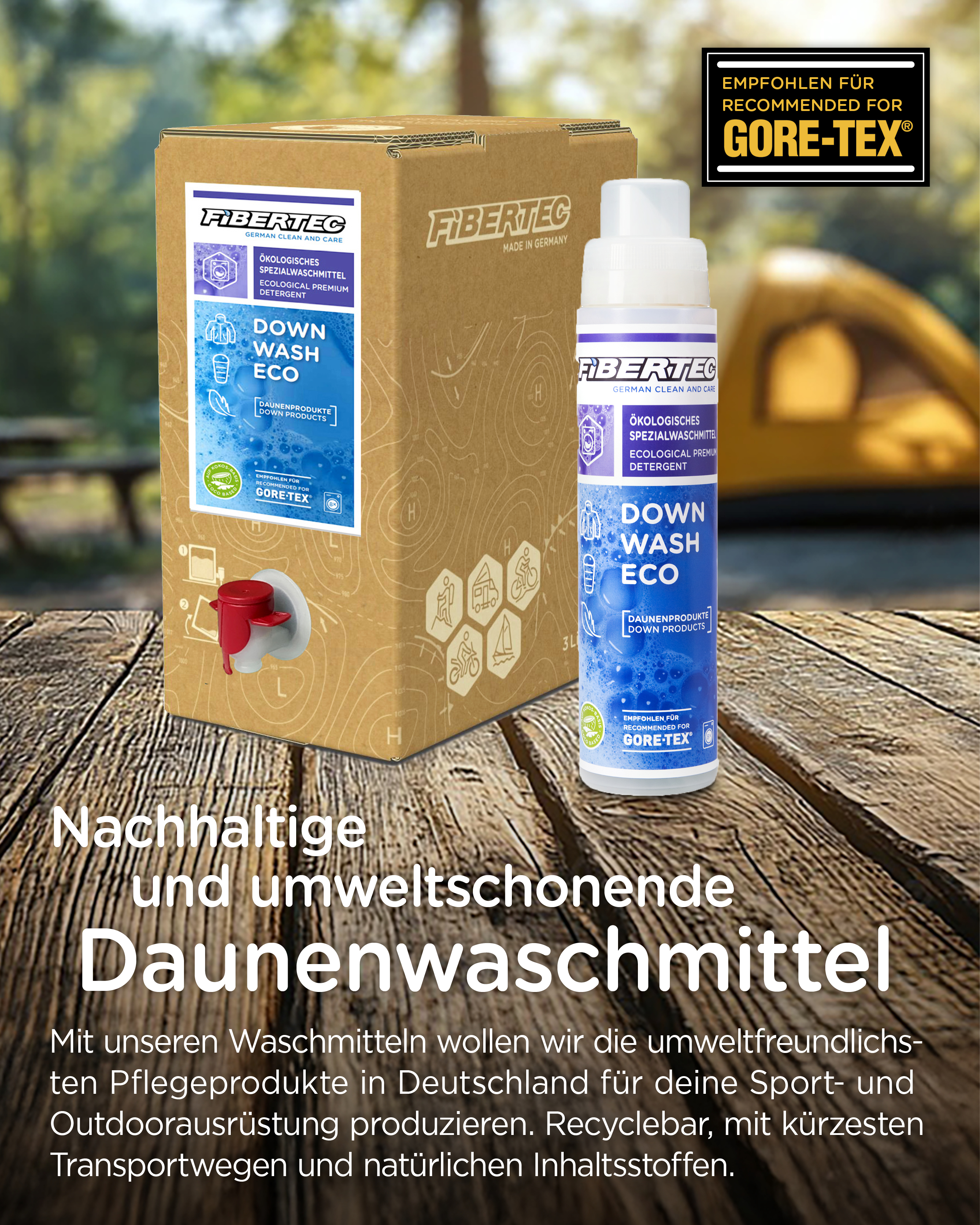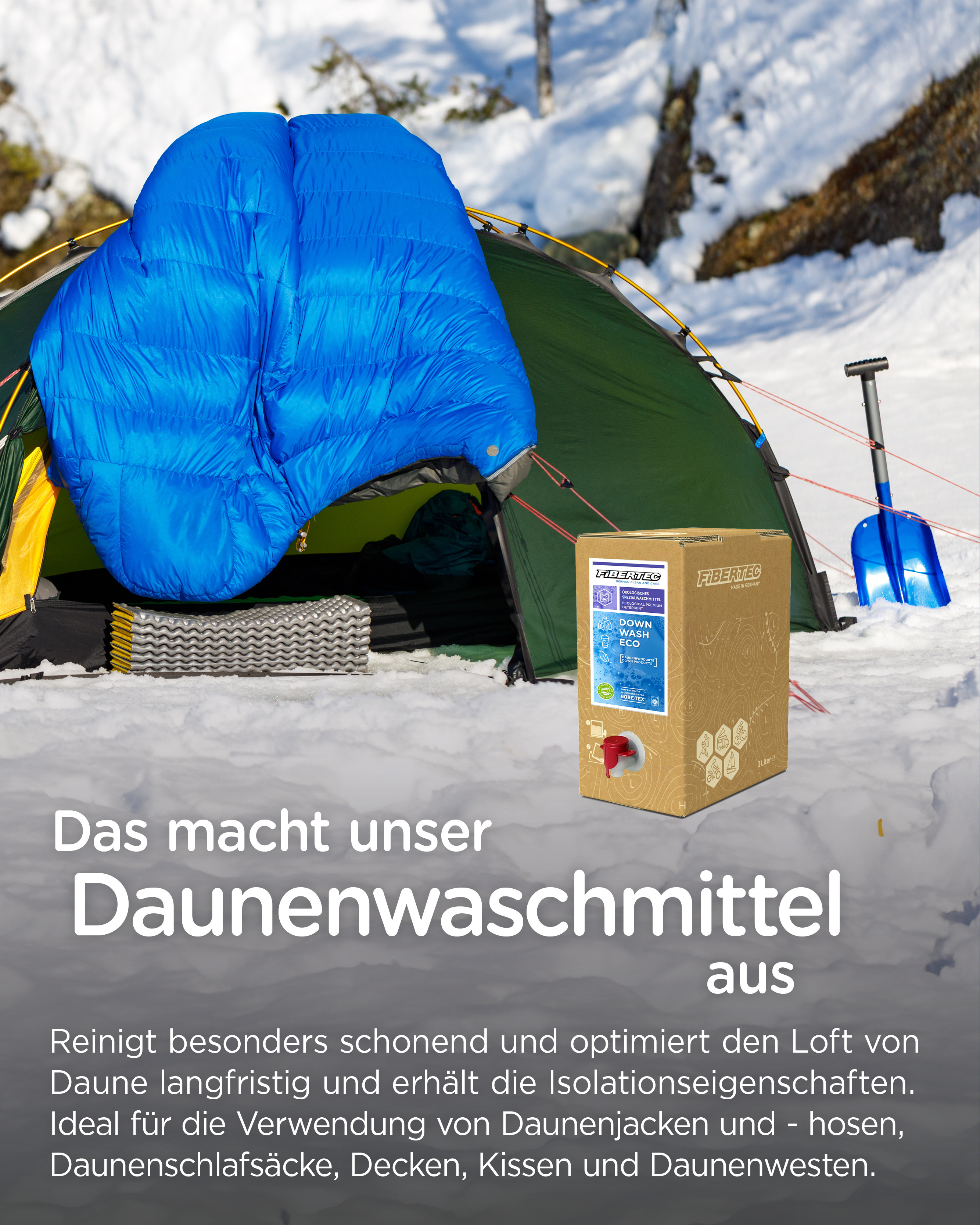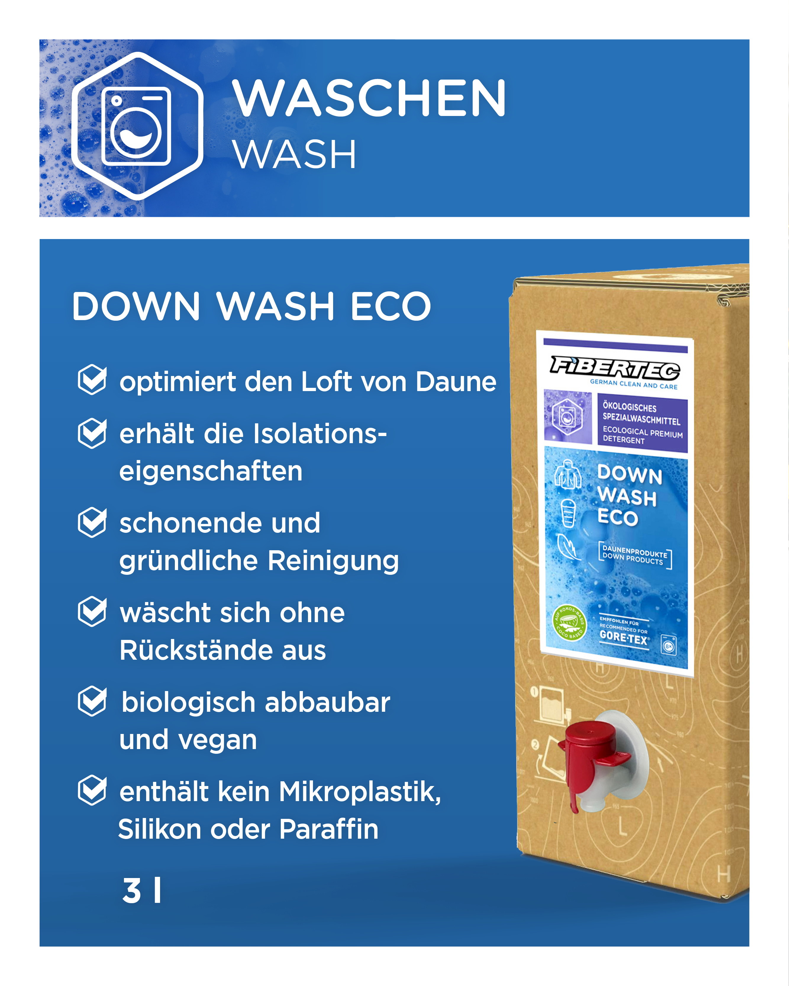 Fibertec Down Wash Eco ist ein mildes Waschmittel zur besonders schonenden Reinigung von Schlafsäcken und Bekleidung mit Daunenfüllung. Spezialtenside beugen einer Entfettung der Daune vor. Die feinen Daunenfilamente bleiben weich, geschmeidig und optimal bauschfähig. Loft und Isoliereigenschaften bleiben auch nach einer Vielzahl von Wäschen und über Jahre optimal.