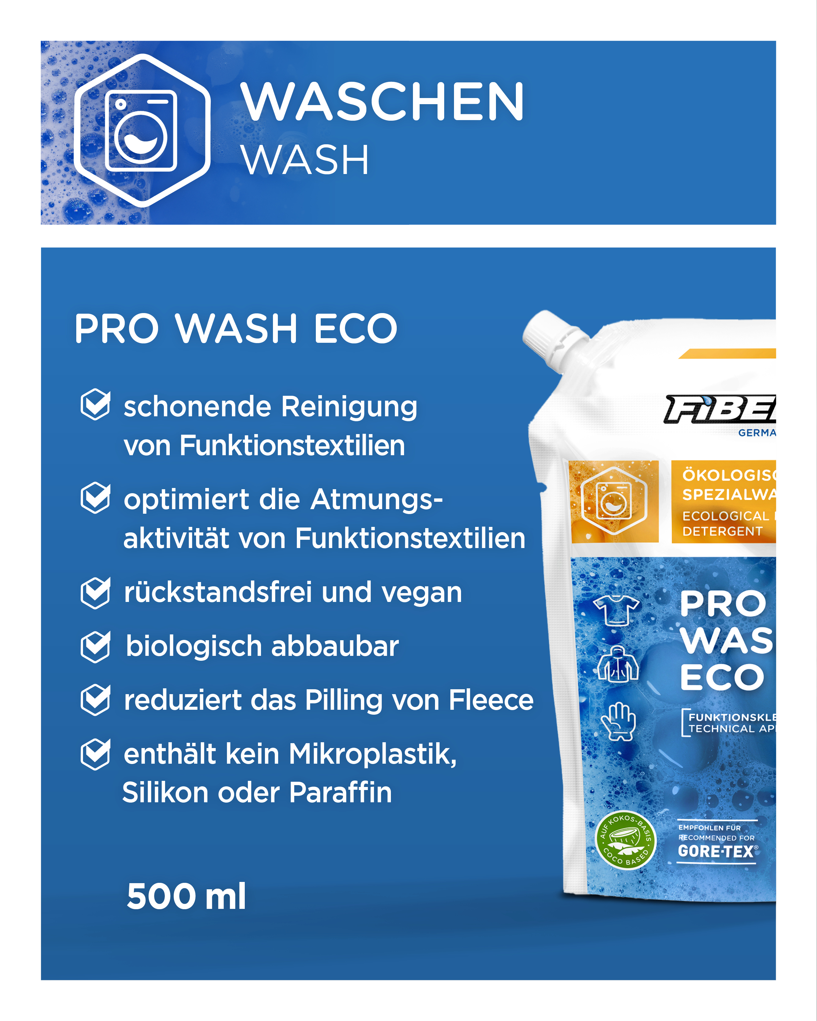 ProWash Eco ist unser umweltfreundliches Waschmittelkonzentrat für alle Arten von Funktionsbekleidung, Softshells und Fleece. Dank der ausgewählten Rohstoffe reinigt es moderne Funktionsbekleidung besonders schonend und gründlich. Pro Wash Eco bringt ausgezeichnete Waschergebnisse auch bei niedrigen Temperaturen. Es wäscht sich rückstandsfrei aus und optimiert die Atmungsaktivität wasserdichter-atmungsaktiver Bekleidung. Außerdem mindert es das Pilling von Fleece. Die verwendeten Tenside und Seifen werden auf Basis von Kokos-Öl hergestellt. ProWash Eco enthält keinen Weichspüler, Bleichmittel, Mikroplastik oder optische Aufheller und ist vegan. Seine Inhaltsstoffe sind leicht biologisch abbaubar (gemäß Verordnung (EG) Nr. 648/2004). ProWash Eco ist für die Reinigung von Funktionsmembranen empfohlen.