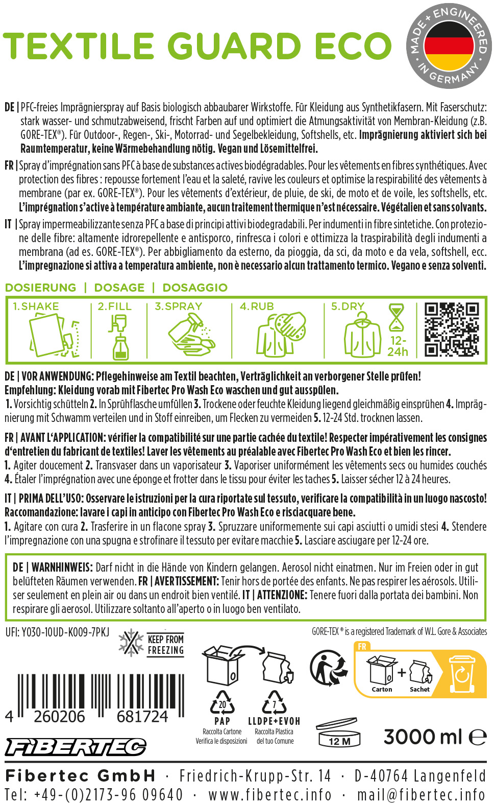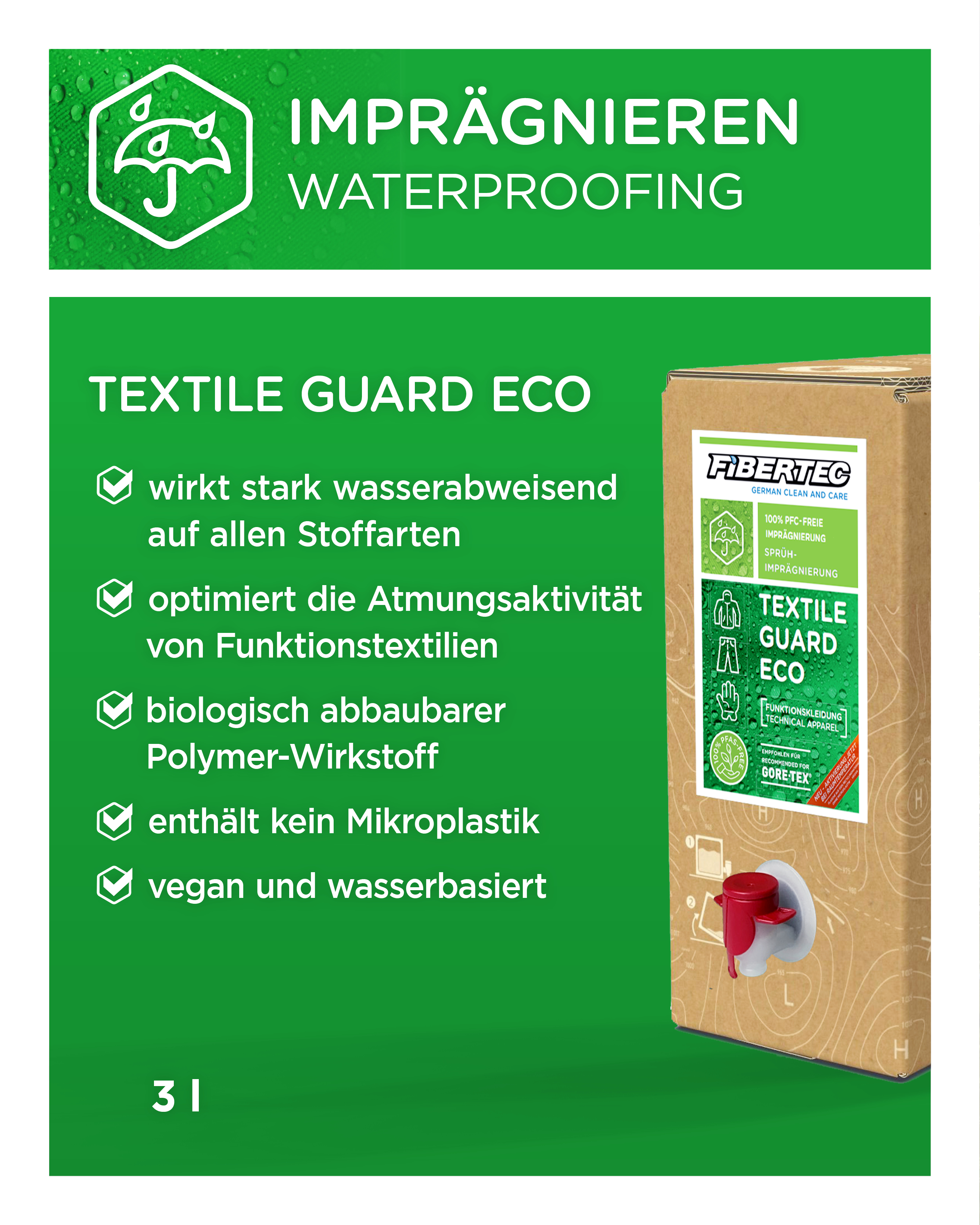 Textile Guard Eco ist unsere PFC-freie Variante des Testsiegers "Textile Guard Pro". Mit Textile Guard Eco RT setzen wir Maßstäbe im Bereich der fluor-freien Imprägniermittel. Es ist das wahrscheinlich umweltfreundlichste Imprägniermittel am Markt, denn es enthält einen patentierten Wirkstoff auf Polymer-Basis, der vollständig biologisch abbaubar ist. Textile Guard Eco RT ist sehr stark wasserabweisend und optimiert die Atmungsaktivität von Membranbekleidung. Es ist für GORE-TEX® und andere Membranbekleidung empfohlen und bluesign approved.